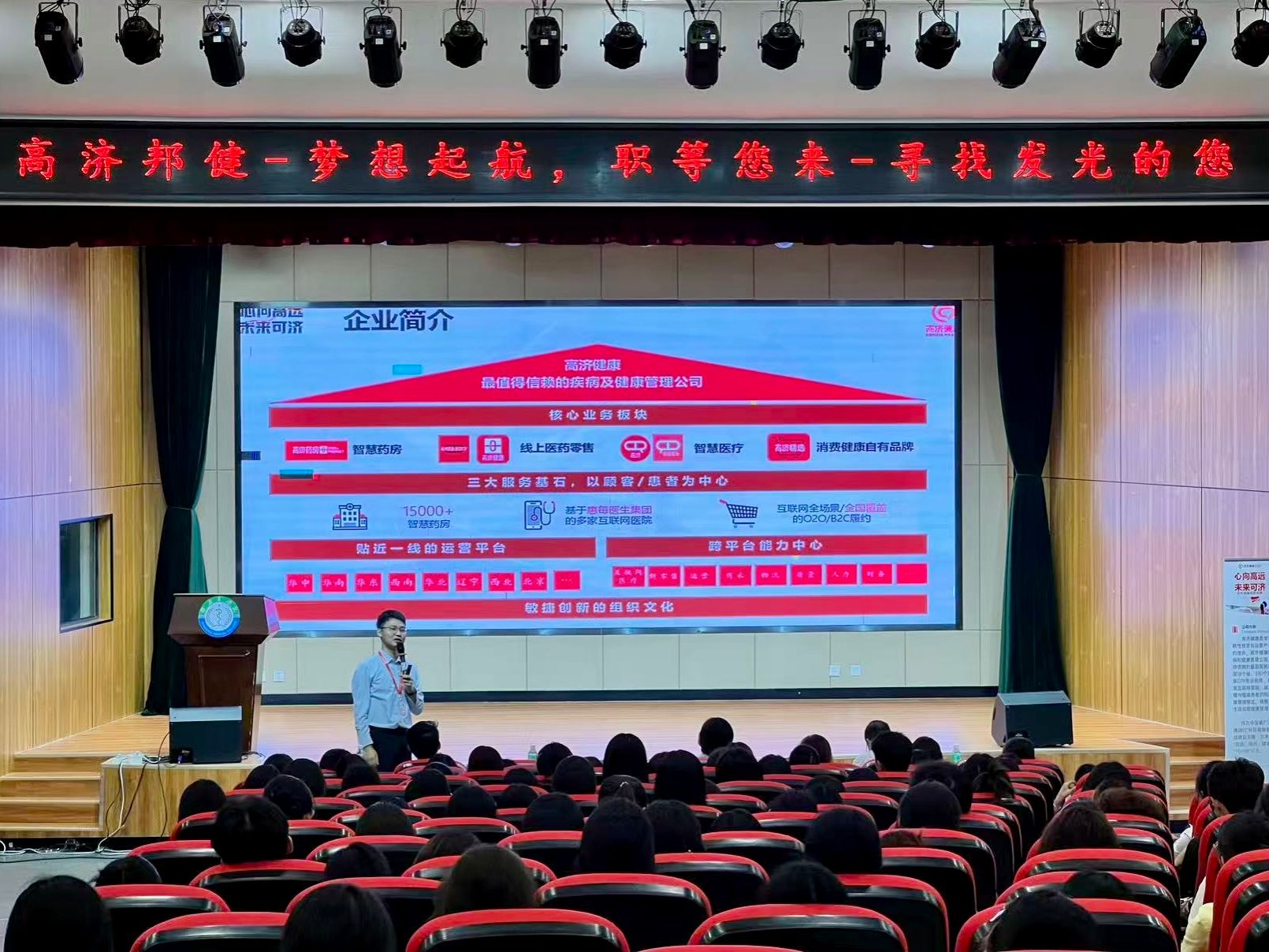随后,学院优秀毕业生吴万鸿经理为大家介绍了高济邦健的企业发展、业务布局等情况,重点解读实习生待遇、培养体系及实习岗位配置等同学们关切的问题。