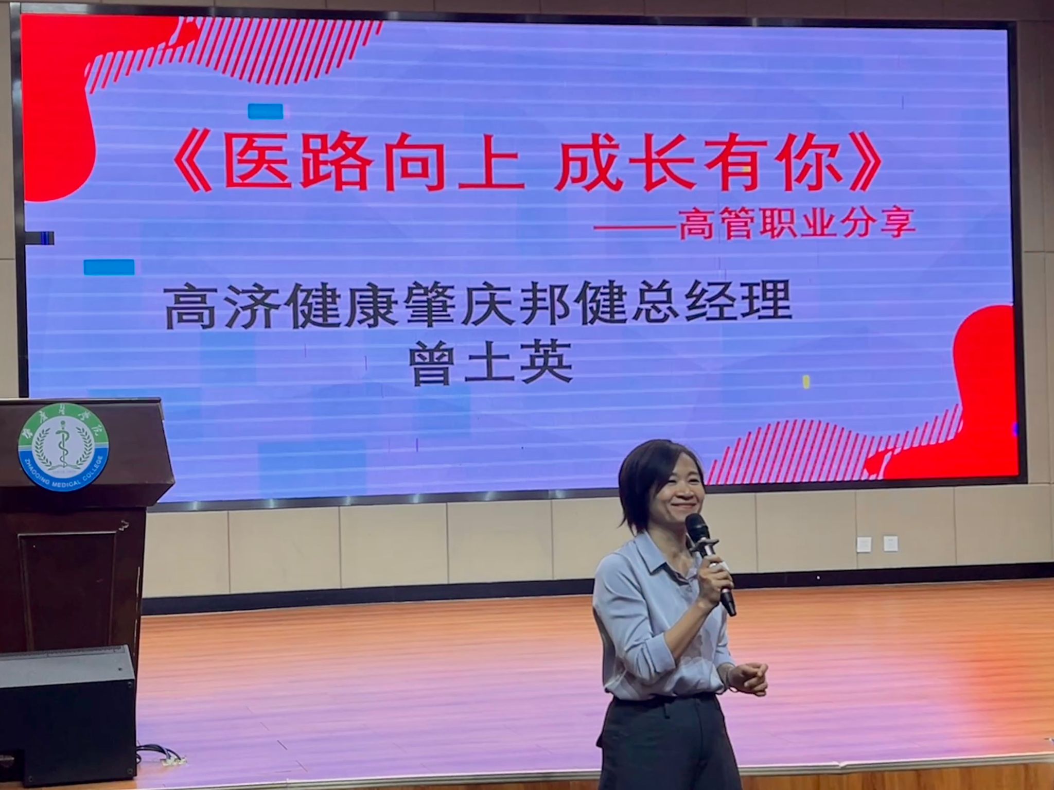 优秀校友、高济健康肇庆邦健总经理曾土英以《医路向上成长有你》为题,结合自身丰富的职场经历与成长感悟,为同学们分享了宝贵的职业发展心得。她寄语广大学子要抢抓行业发展机遇,夯实专业基础,提升综合素养。同时,她对学院的人才培养质量给予高度评价,并热切期盼进一步深化校企合作,携手推进协同育人。